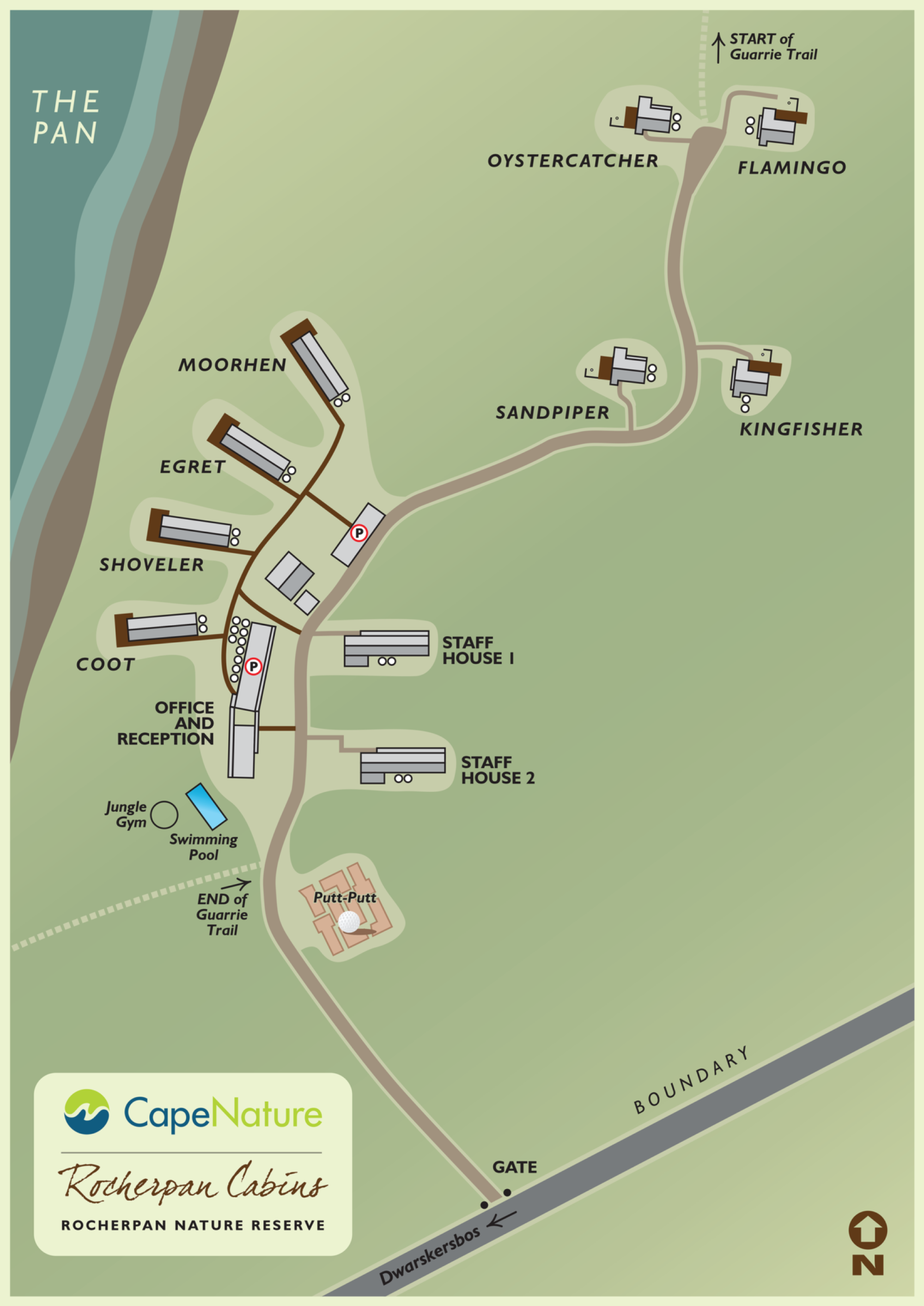 Coot, Moorhen, Egret and Shoveler are the four newer double bedroom cabins available at Rocherpan Nature Reserve.
