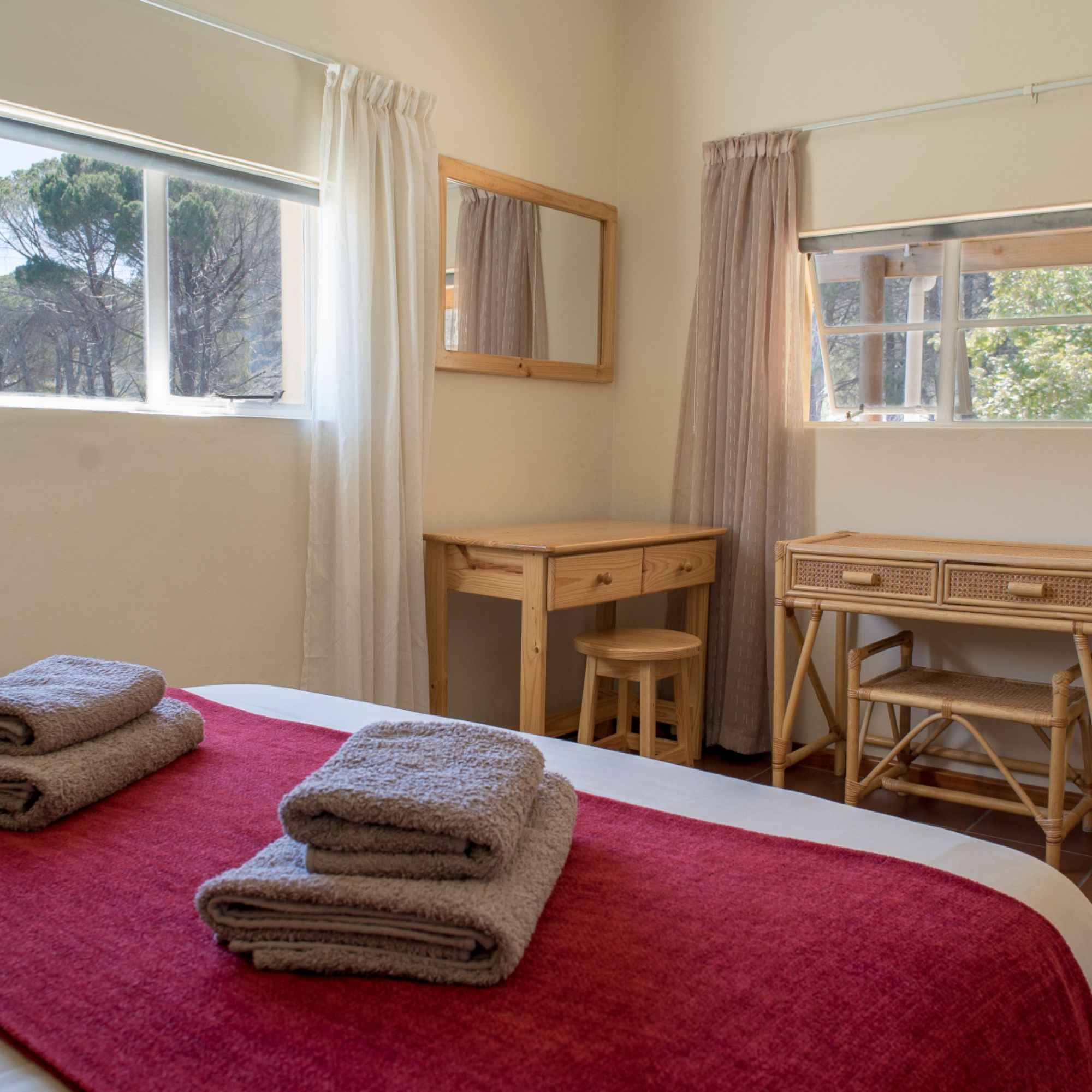 Our fully equipped chalets, Rhino Boulder, Cedar Rouge, and Leopard Cave, each offer three bedrooms, accommodating up to six people. One of the rooms features a comfortable double bed, while the other two rooms have single beds. Additionally, the lounge area includes two single daybeds for extra sleeping space.