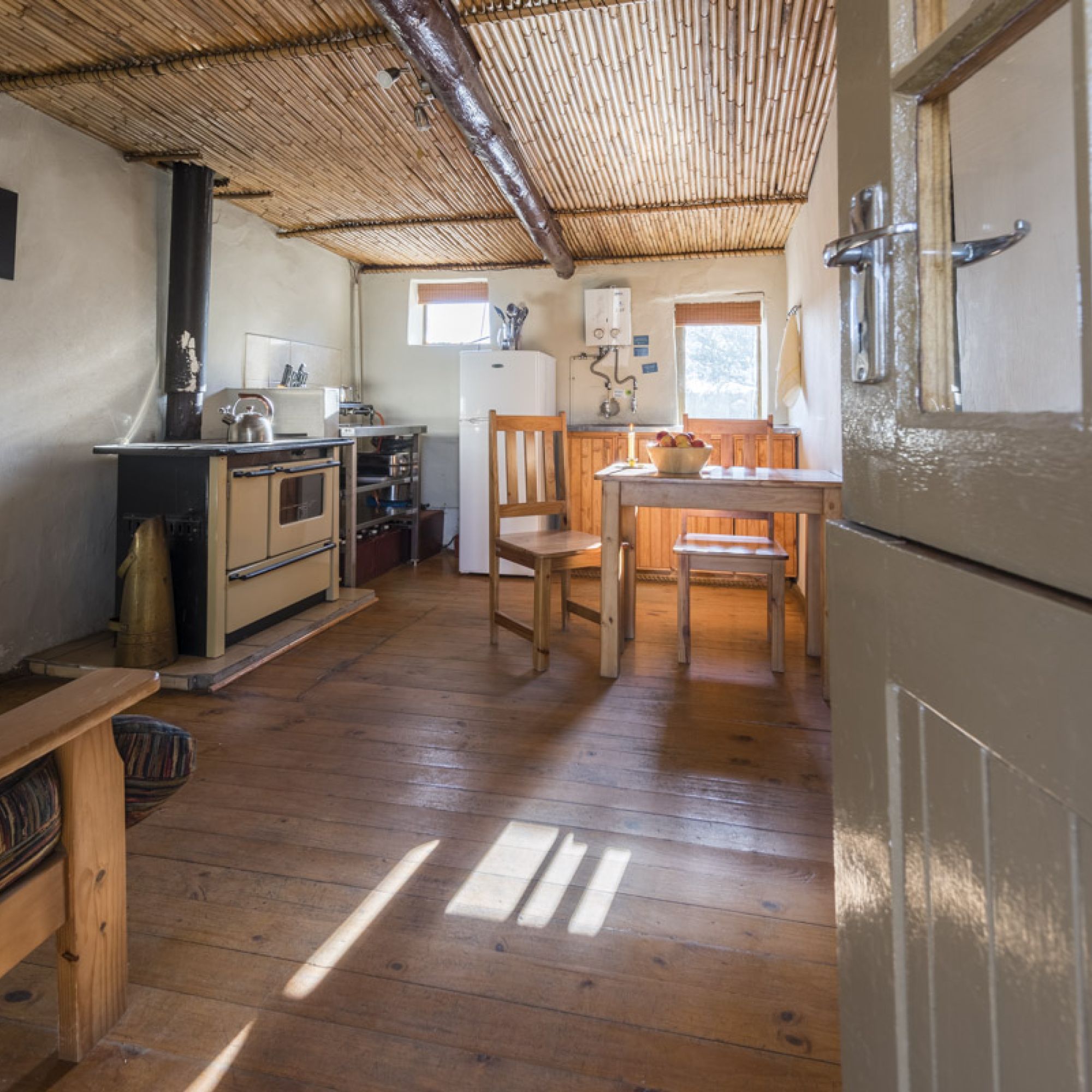 Kitchen: Gas hob, solar fridge, and Dover stove inside for cold days