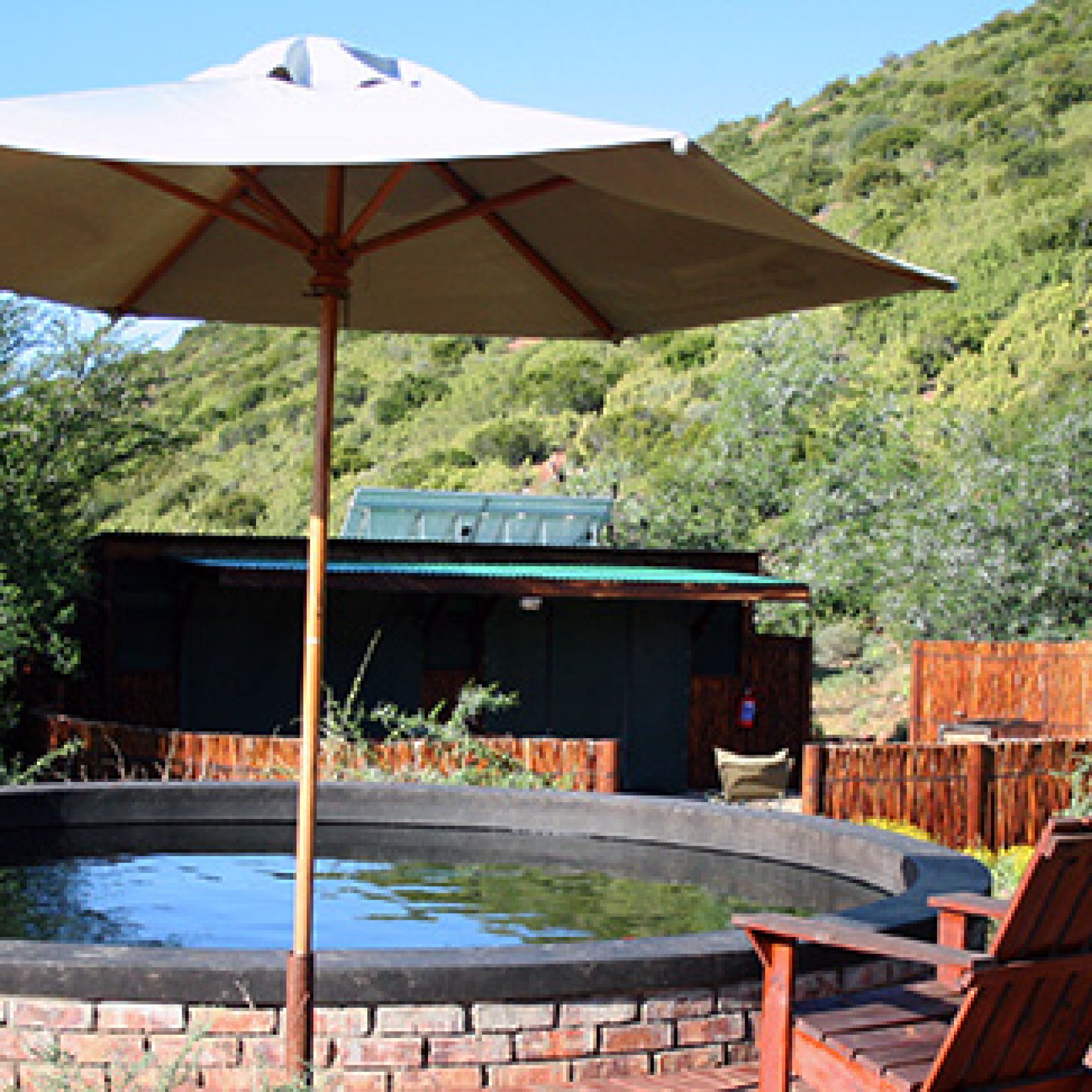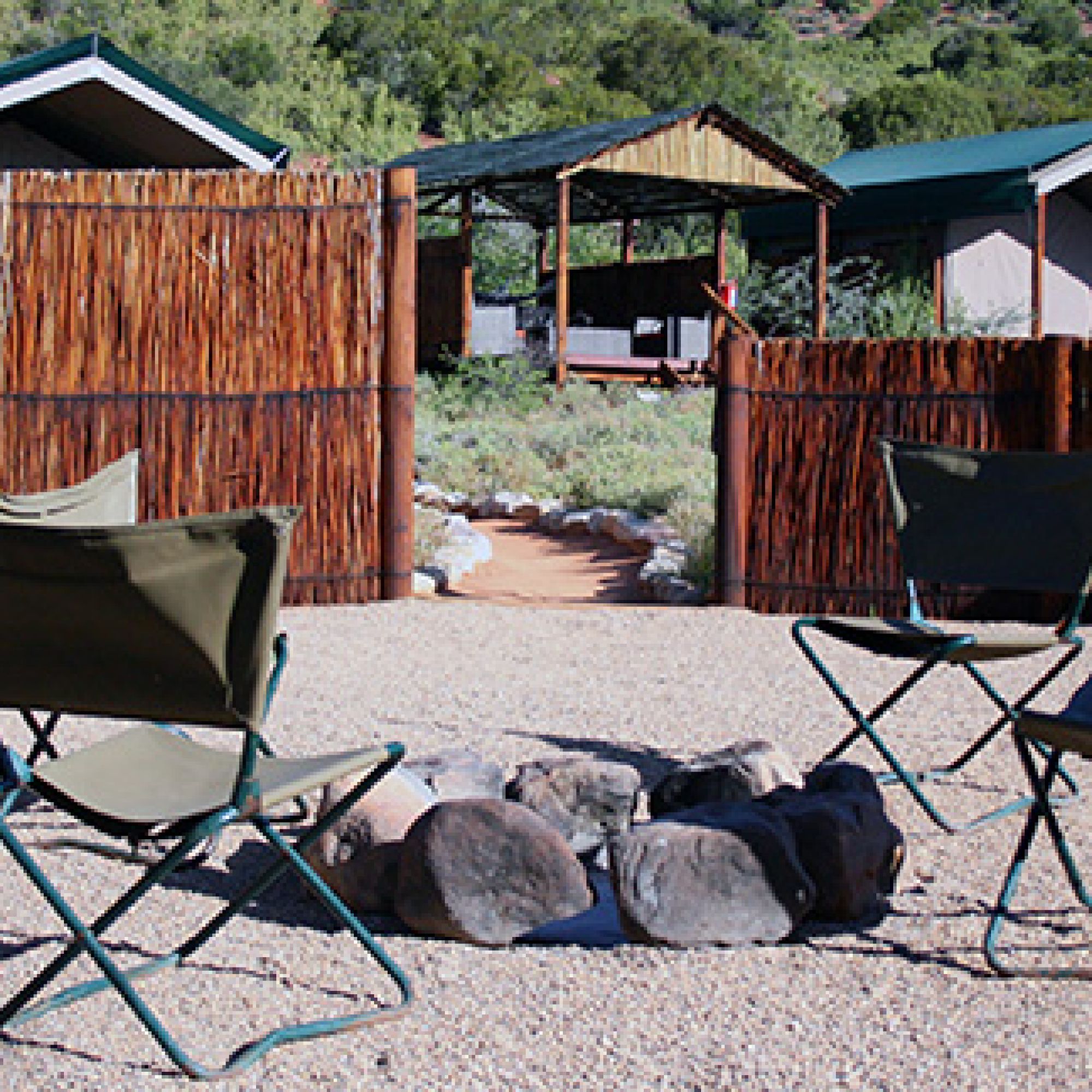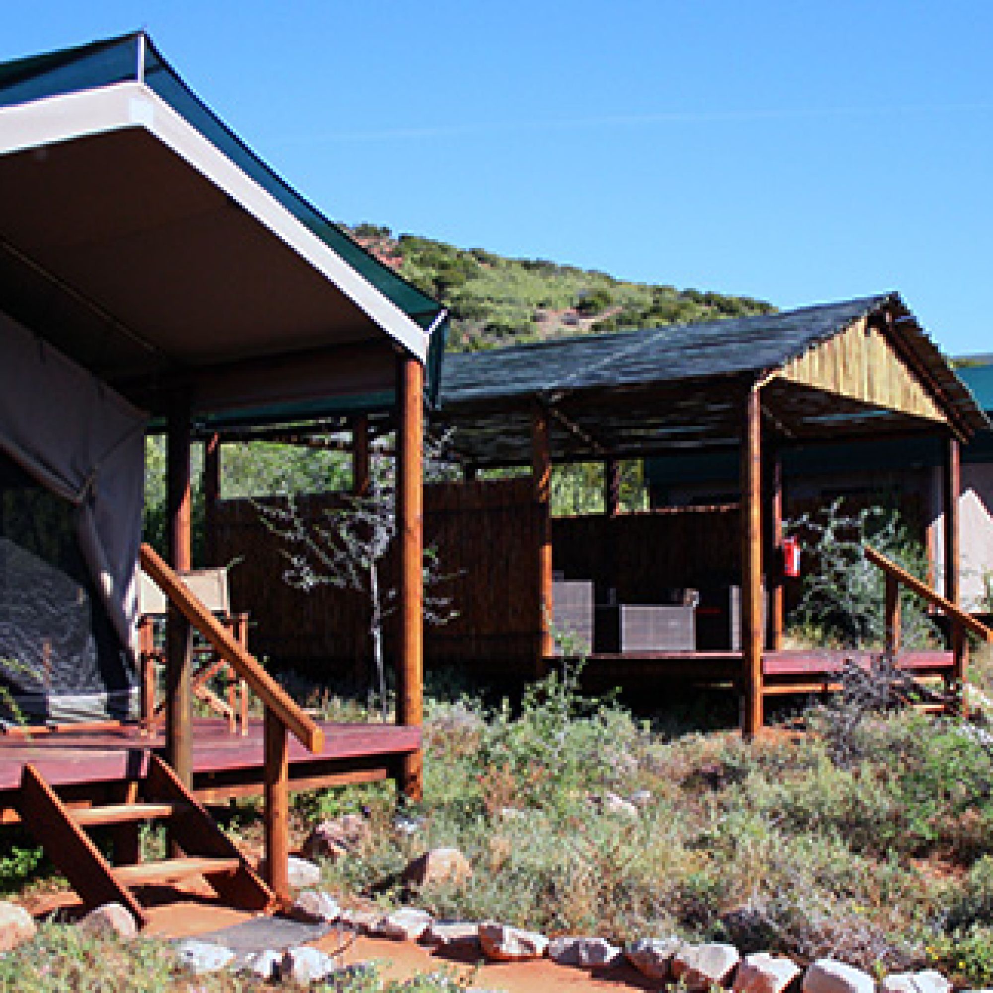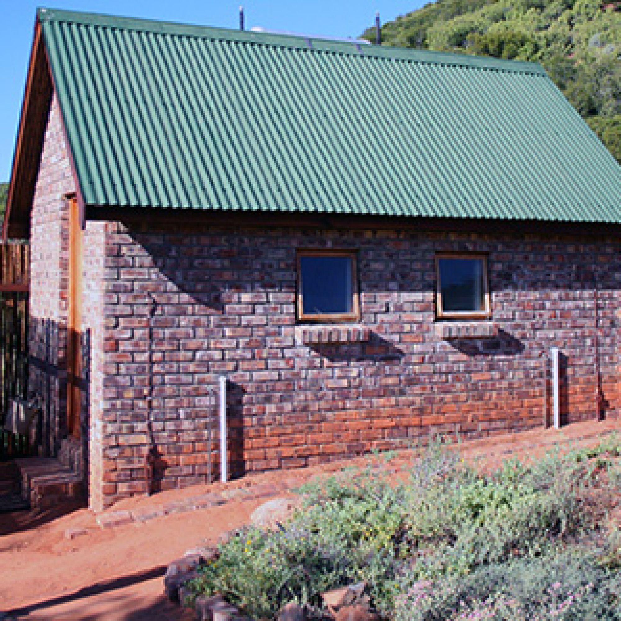 Rustic accommodation built from poles and reed, situated in Sweetthorn thicket at the foot of the Gamkaberg. We take one group at a time, so itโs the ideal private getaway for family and friends, with various day hikes available.