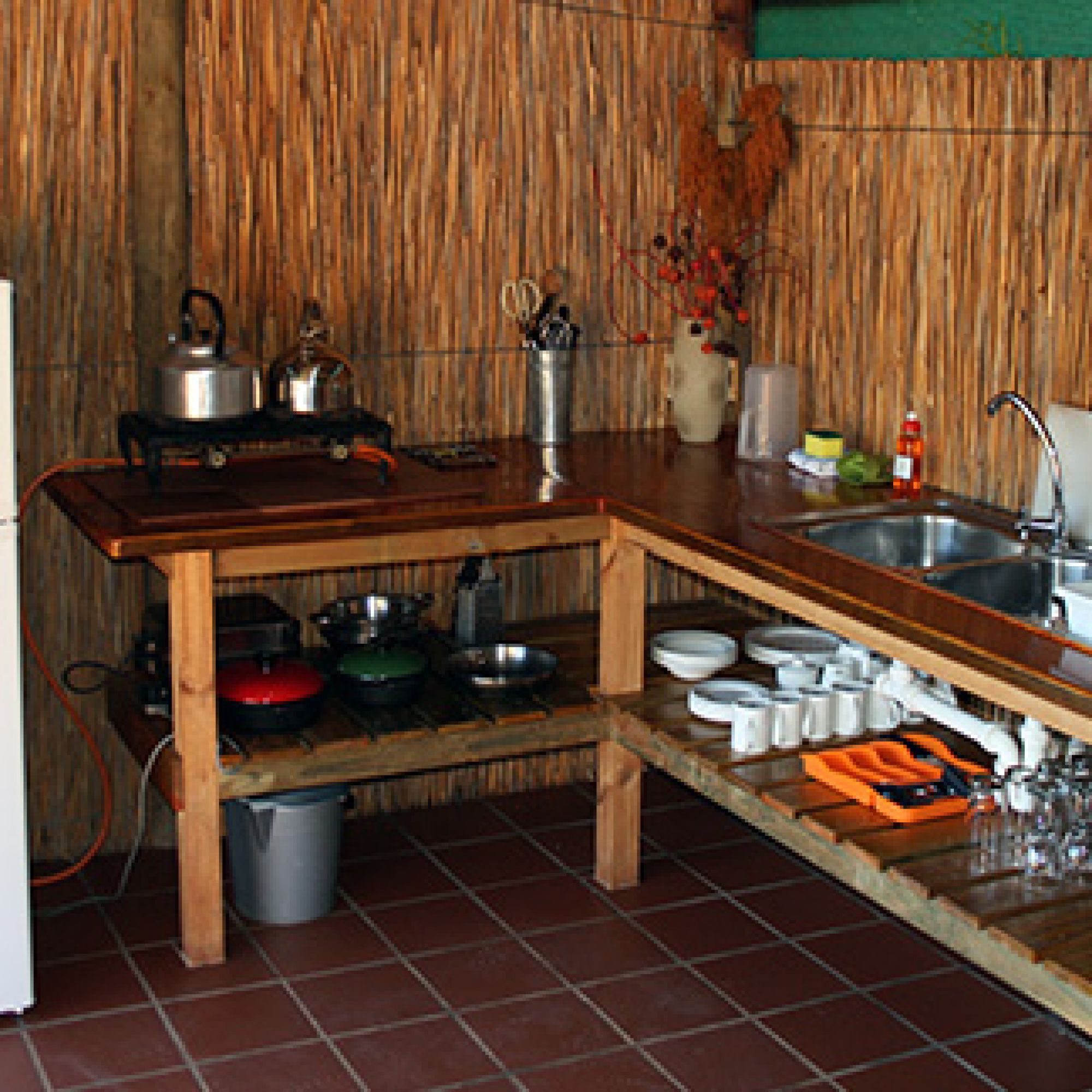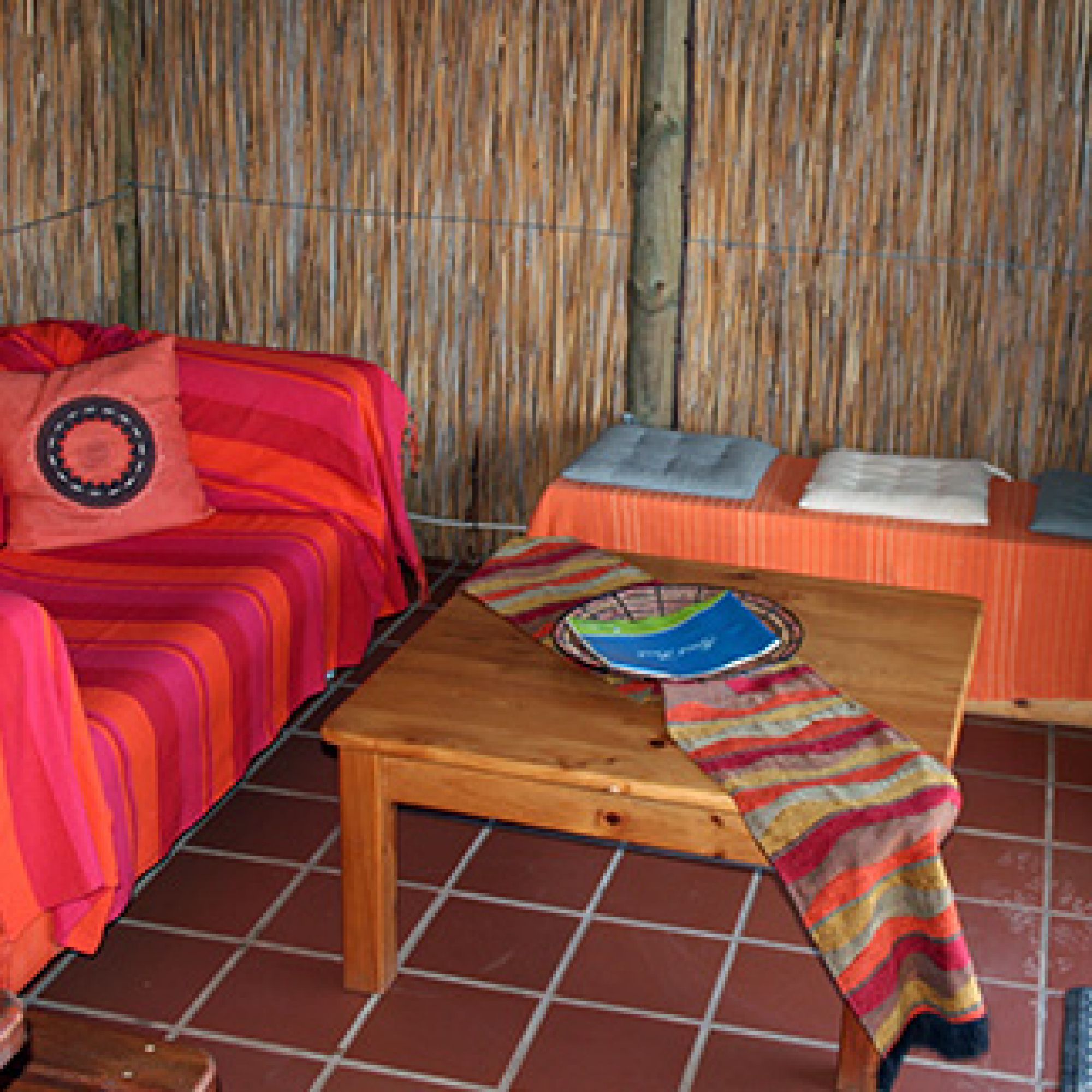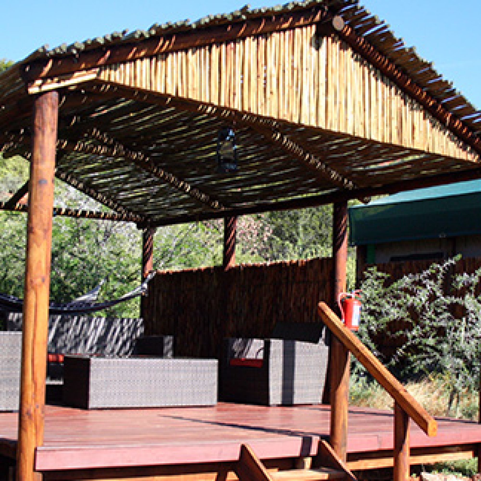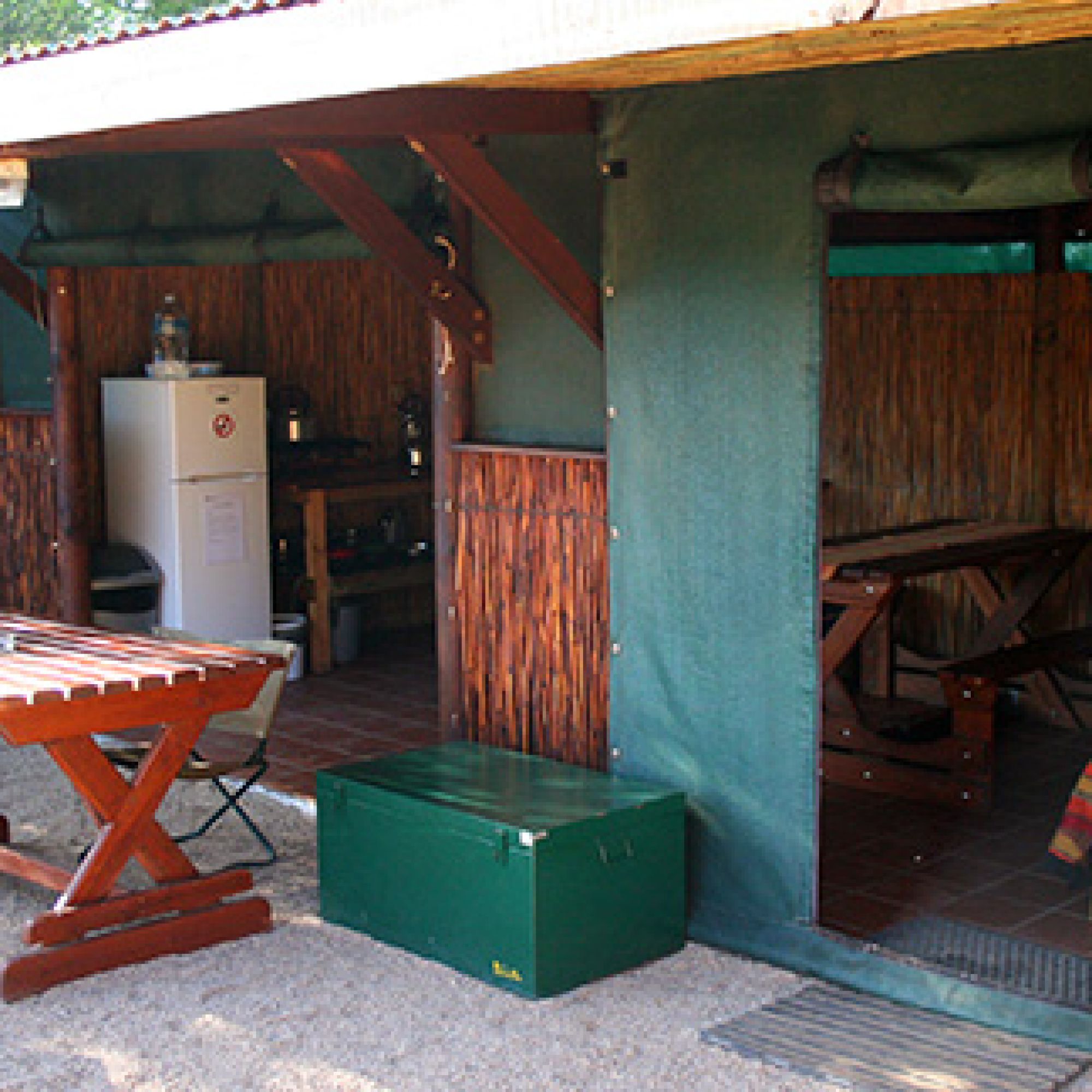 The lapa consists of a kitchen/dining room and a living area. Separate from this are three safari-style tents pitched on decks, two with two single beds and one with a double bed.