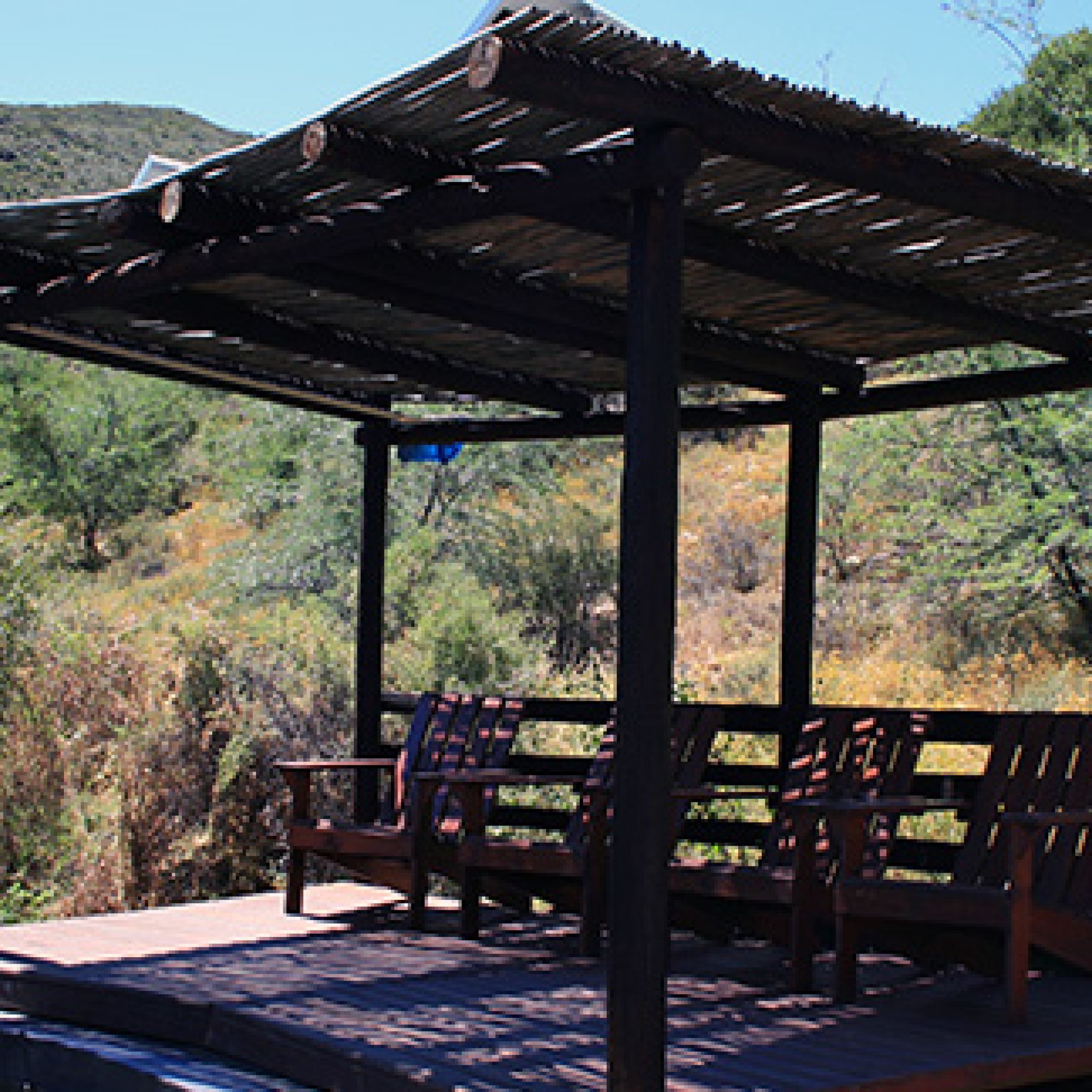 Rustic accommodation built from poles and reeds, situated in Sweetthorn thicket at the foot of the Gamkaberg. We take one group at a time, so itโs the ideal private getaway for family and friends, with various day hikes available.
