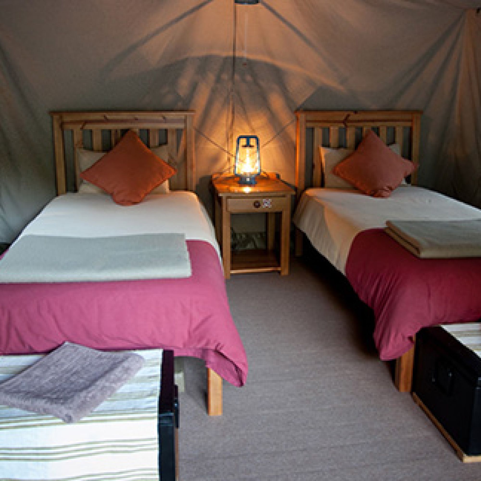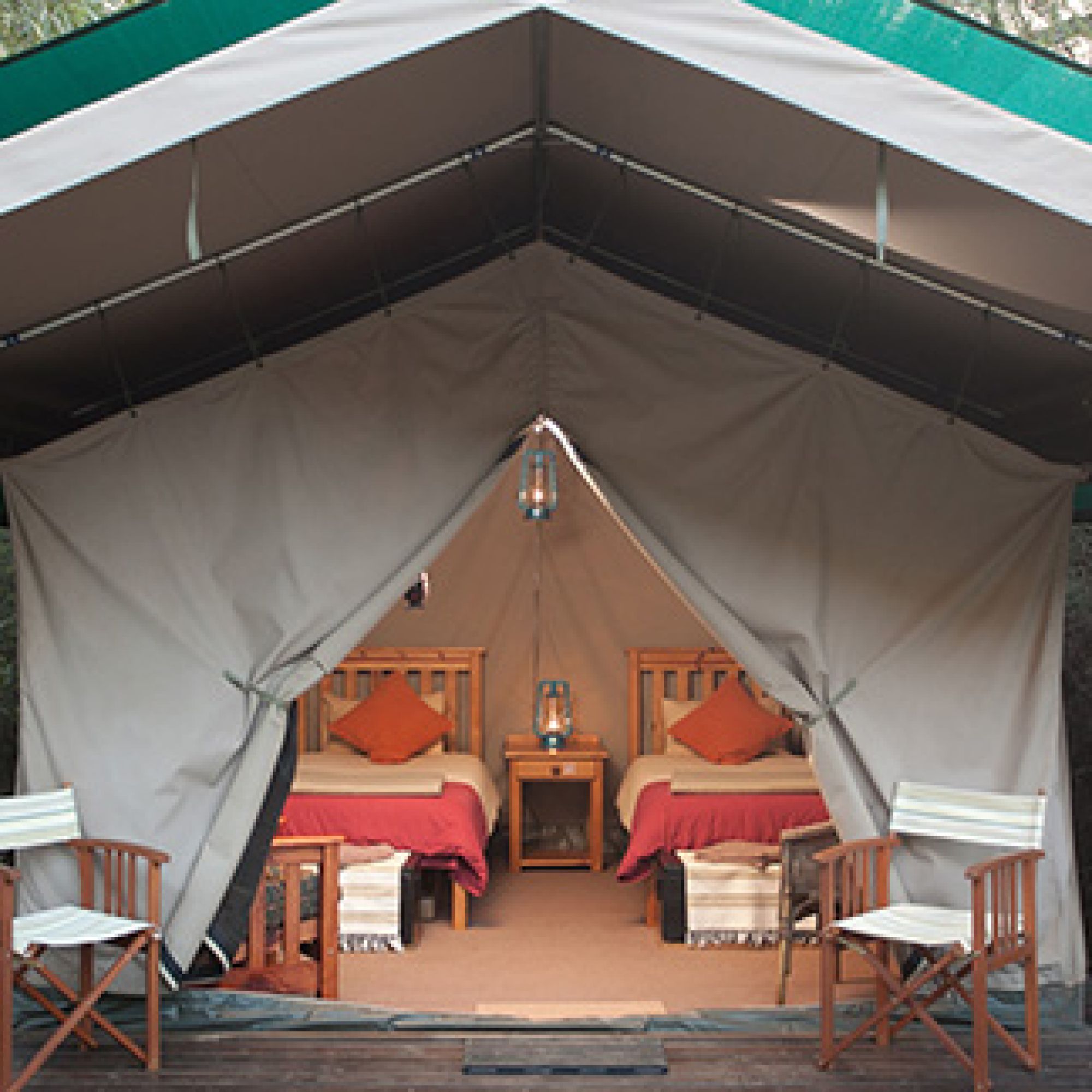 The lapa consists of a kitchen/dining room and a living area. Separate from this are three safari-style tents pitched on decks, two with two single beds and one with a double bed.