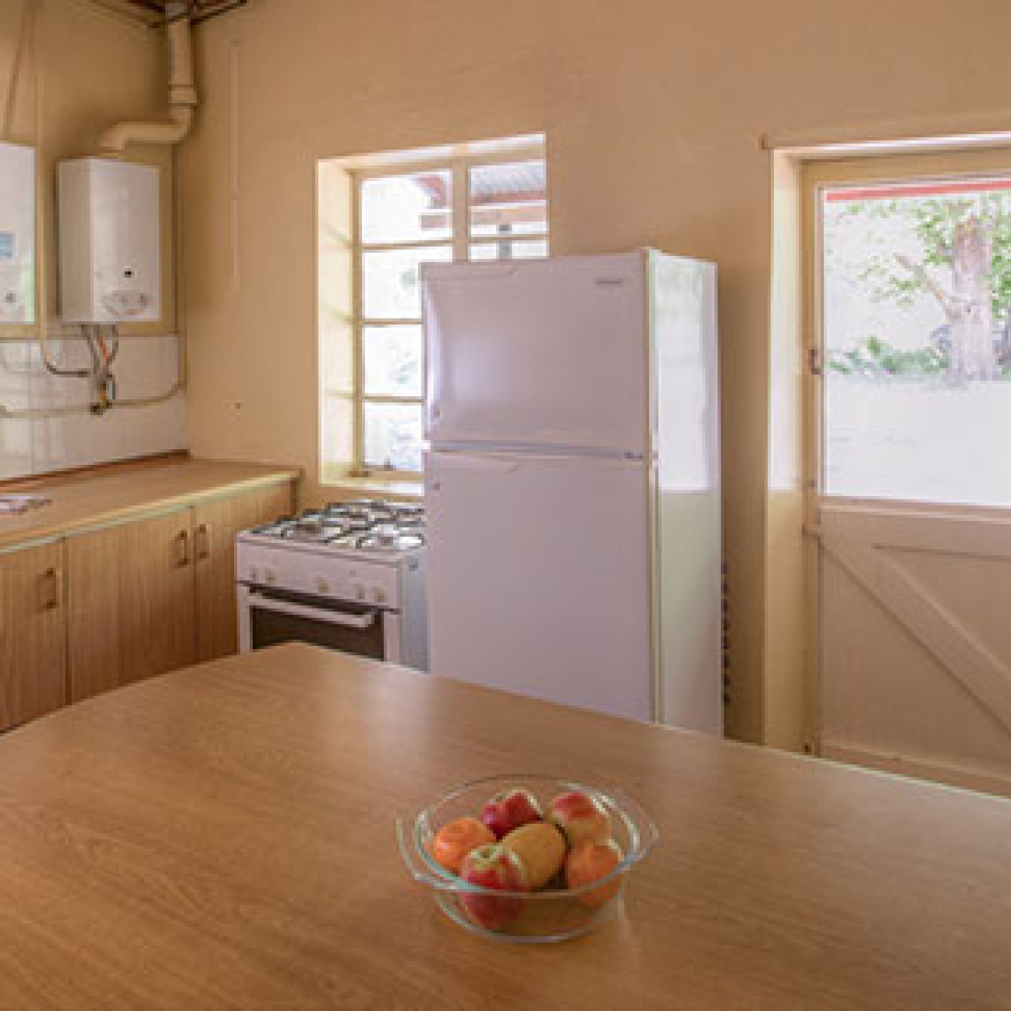 Kitchen: Gas stove and solar-powered fridge, cutlery and crockery