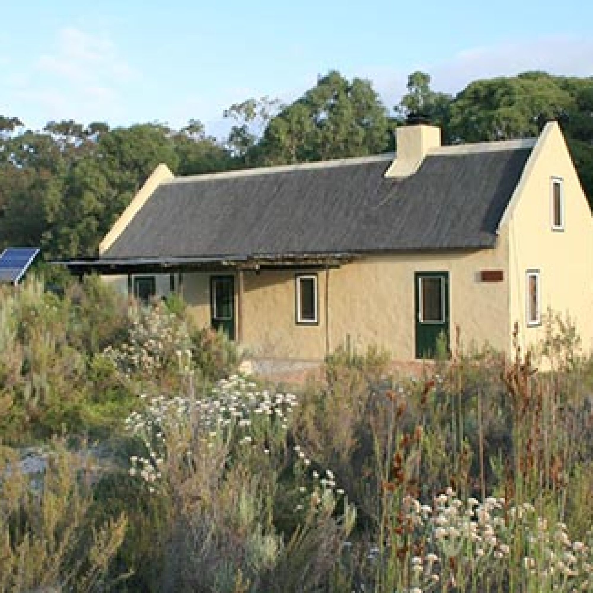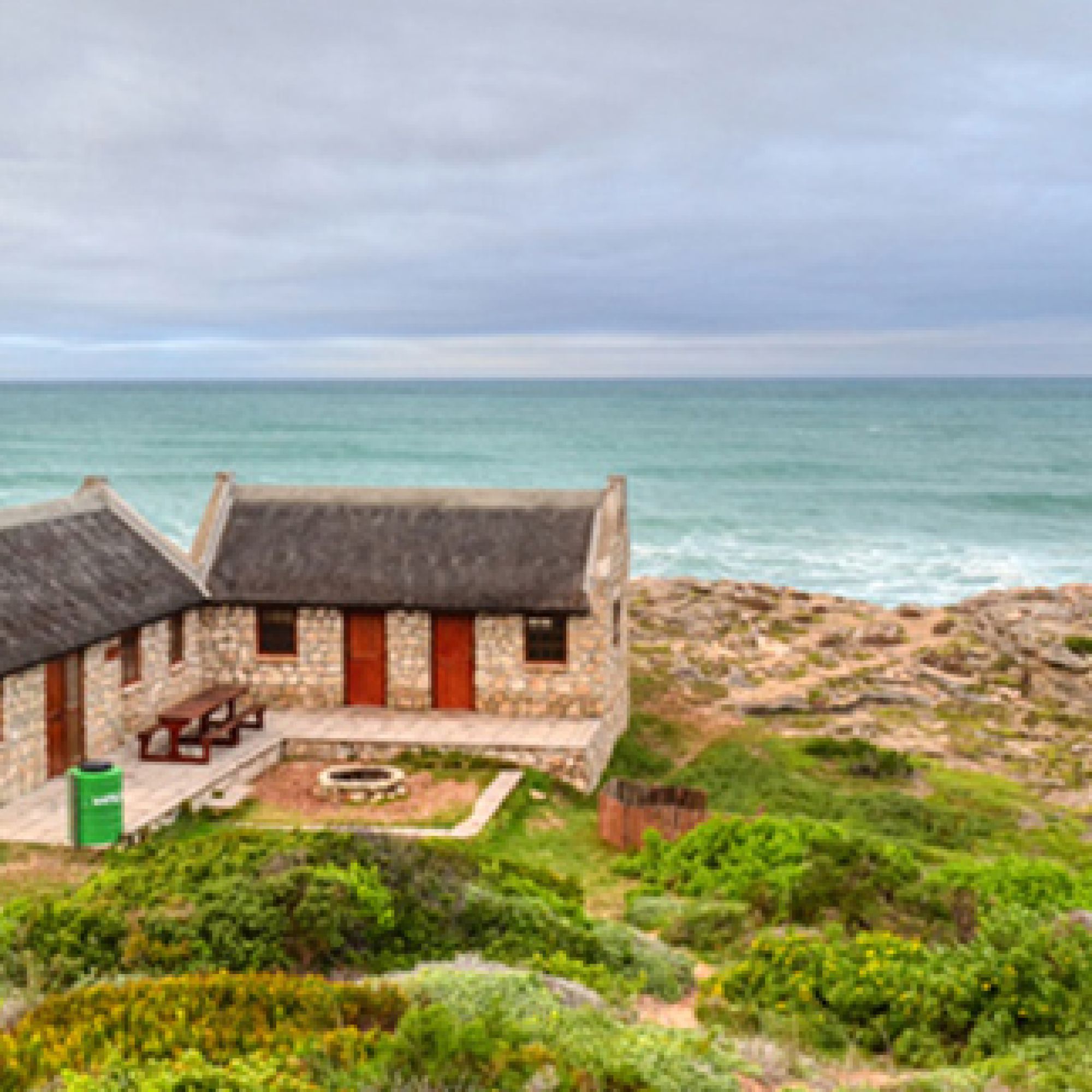 The five Whale Trail overnight cottages lie at the foot of the Potberg Mountains, perched high on a sea cliff. The charming cottages range from Arniston-style units to A-framed thatched “kapstyl” cottages. Each fully equipped cottage sleeps up to 12 people, generally with three bedrooms (four beds in each). Hikers bring their own bedding. Dishwashing liquid, toilet paper, matches and candles are provided.