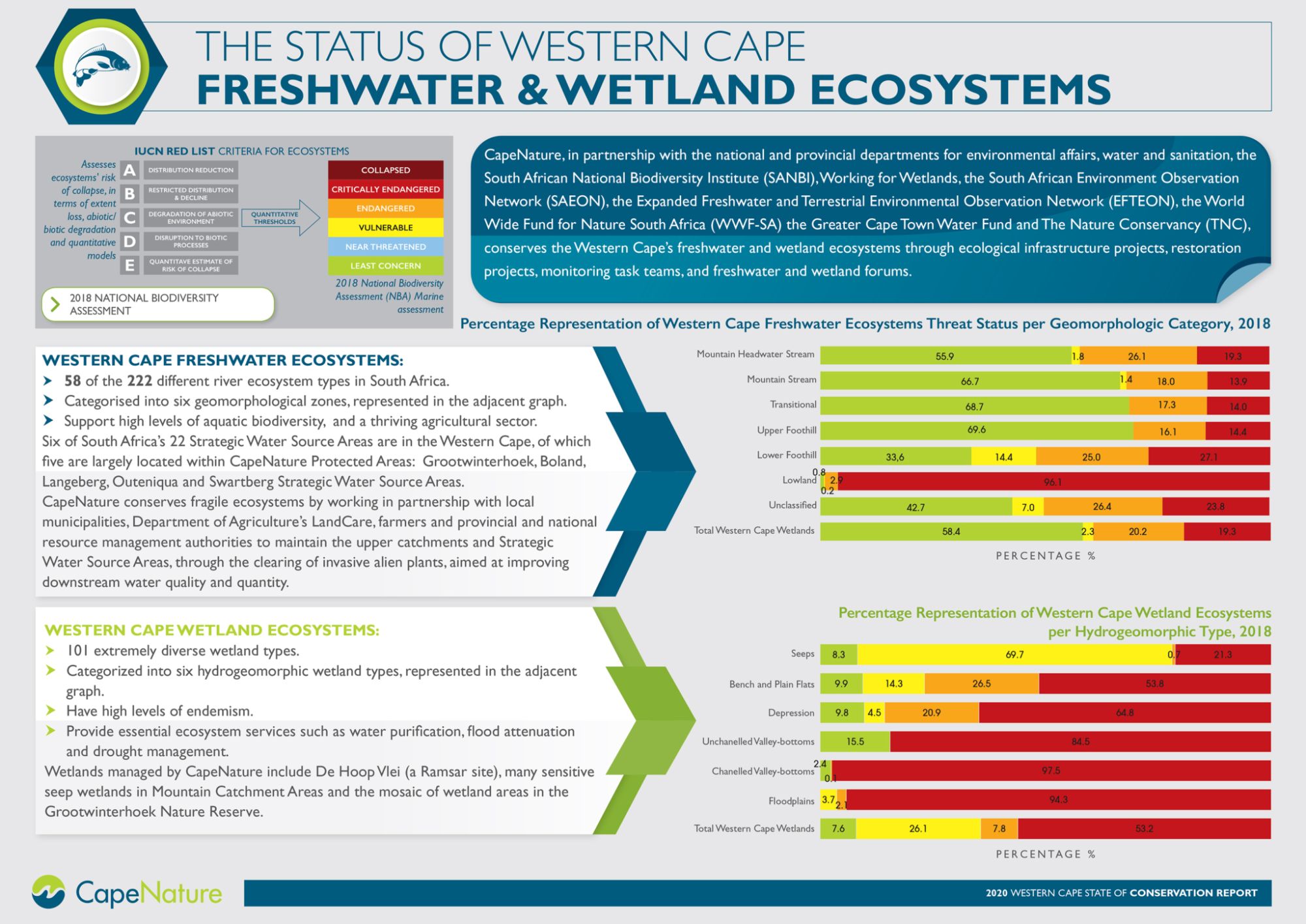 Several initiatives have been established to mitigate an increasing impact on the freshwater ecosystems in the Western Cape. Concerning the protection of certain ecosystem services provided by freshwater ecosystems for water provision for instance, focus has shifted to improved and informed management and protection of the strategic water source areas for both ground and surface water. Paired with this are the projects and initiatives associated with the Greater Cape Town Water Fund (The Nature Conservancy, 2018) and other water fund catchments that are being considered.