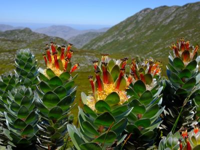 The remarkable floral diversity of this landscape is evident from the distribution patterns of a sample of 1 936 plant taxa from plant families and genera that are characteristic of the Cape flora, such as Proteaceae, Ericaceae, Restionaceae and Bruniaceae. The highest percentage occurrence of these taxa per quarter degree square (20% to 26%) is found in Landscape Central. The great diversity of plants is attributed to the change in complement of species along environmental gradients and the variation in species in the same habitat type from one geographical location to another.