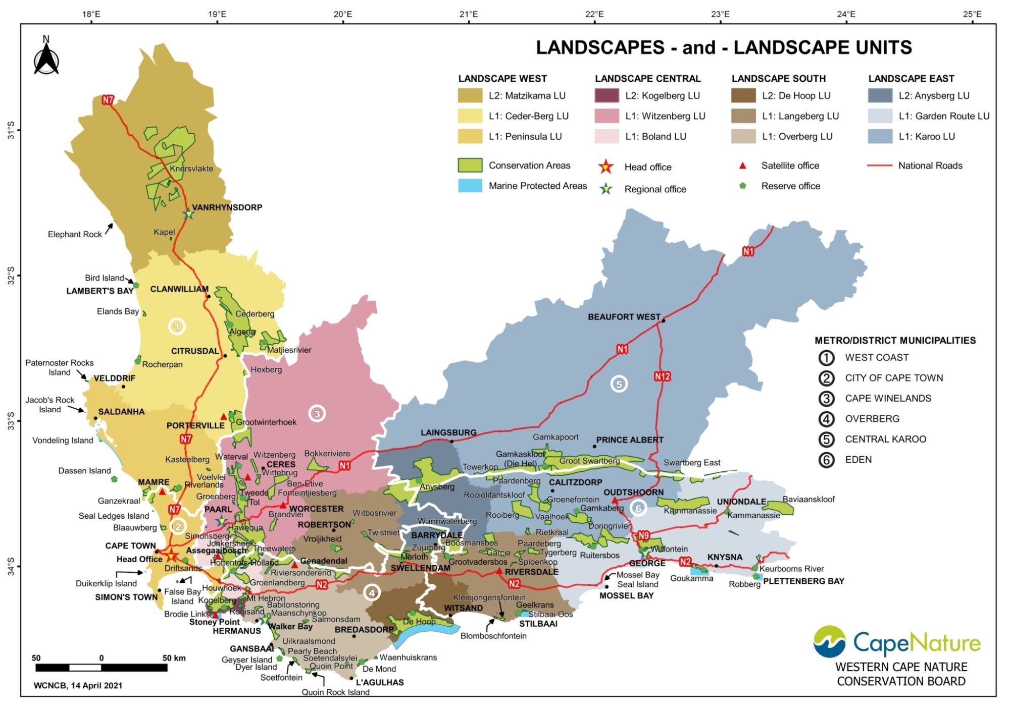 Landscape West is diverse, comprising the City of Cape Town metropole and the West Coast District Municipality areas of jurisdiction, including the local municipalities of Swartland, Saldanha Bay, Bergrivier, Cederberg and Matzikama. Landscape West comprises marine and coastal habitats, lowlands, mountain catchment areas and arid landscapes such as the succulent Karoo. The landscape transitions from a densely populated urban environment in the south to a more rural landscape characterised by towns and villages, agricultural and natural areas towards the north and east.