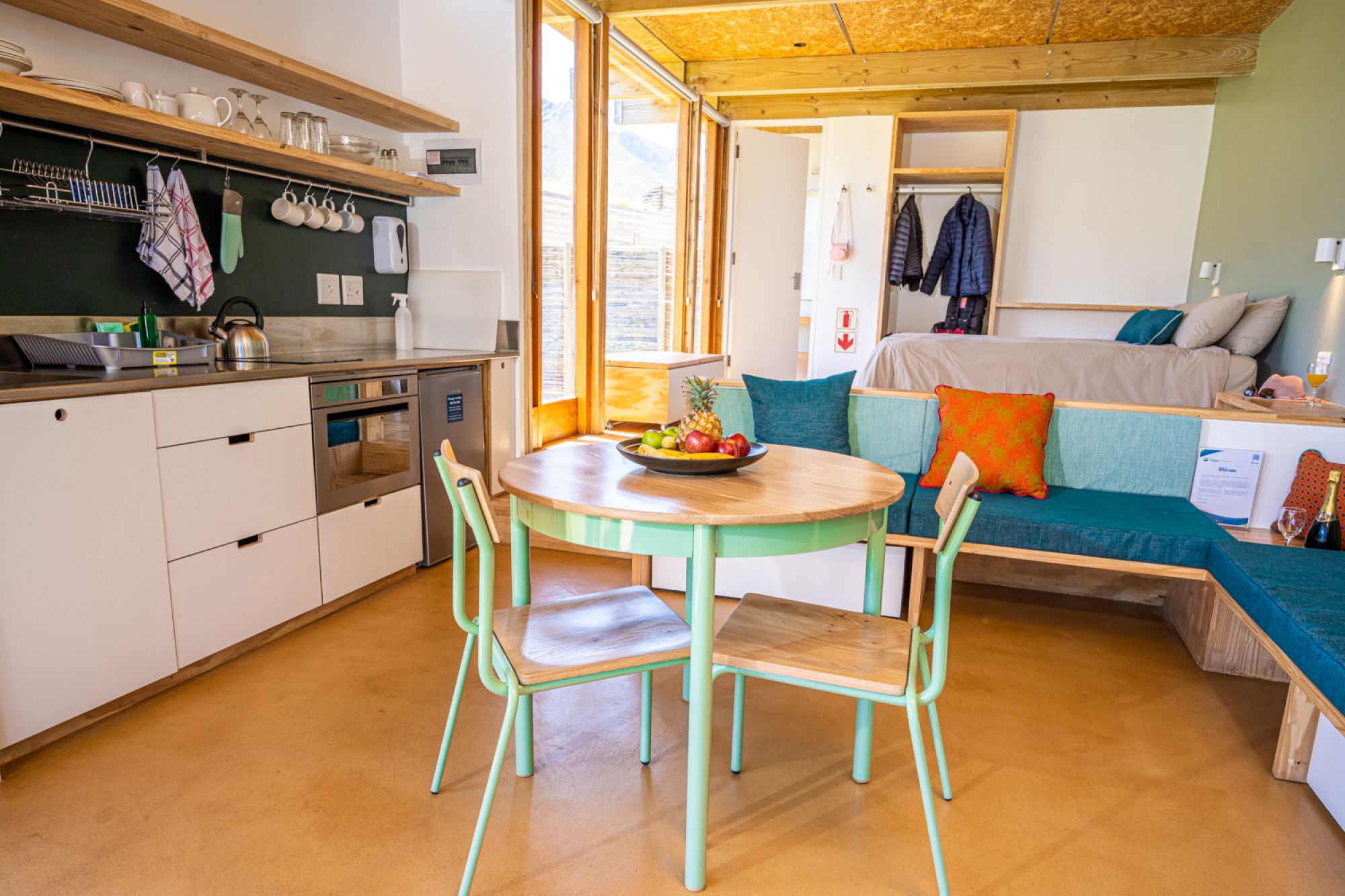 You can lie in bed and look out onto the mountains or chill on the deck where a stone gabion wall ensures privacy. On balmy days the stacking doors let you bring the outside in while the eco-pool invites you to laze the hours away. For nights with a nip in the air, there’s a wood-burning stove at the heart of the cabin.