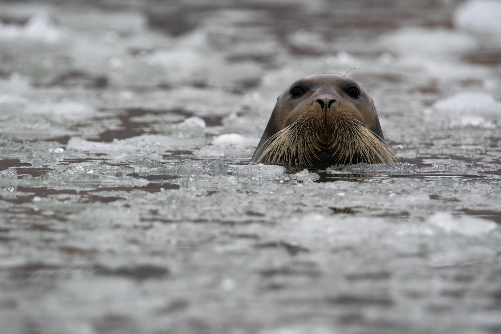 Bearded seals live in an icy habitat in the Arctic and shift as the ice changes and reforms. They are sensitive to environmental changes affecting the timing and extent of ice formation and break up throughout the year. They forage on the ocean floor and young seals can reach up to 450 m deep while looking for food.