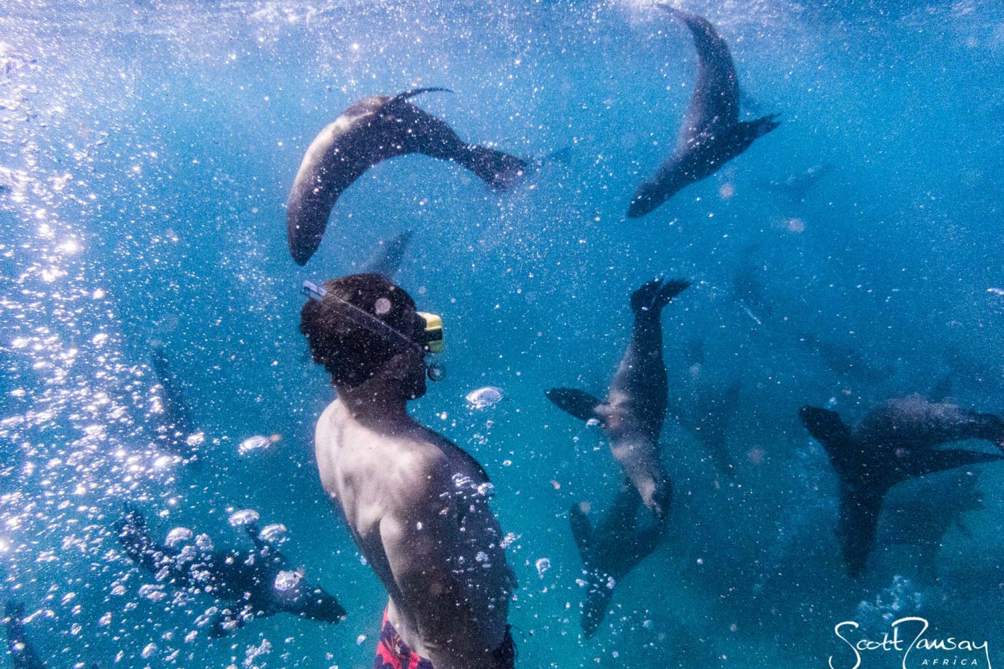During my work as a photographer in Africa’s reserves, I’ve been fortunate to enjoy many encounters with wild animals, but I’d rate snorkeling with seal pups at Robberg as one of the most immersive, fun and rewarding!