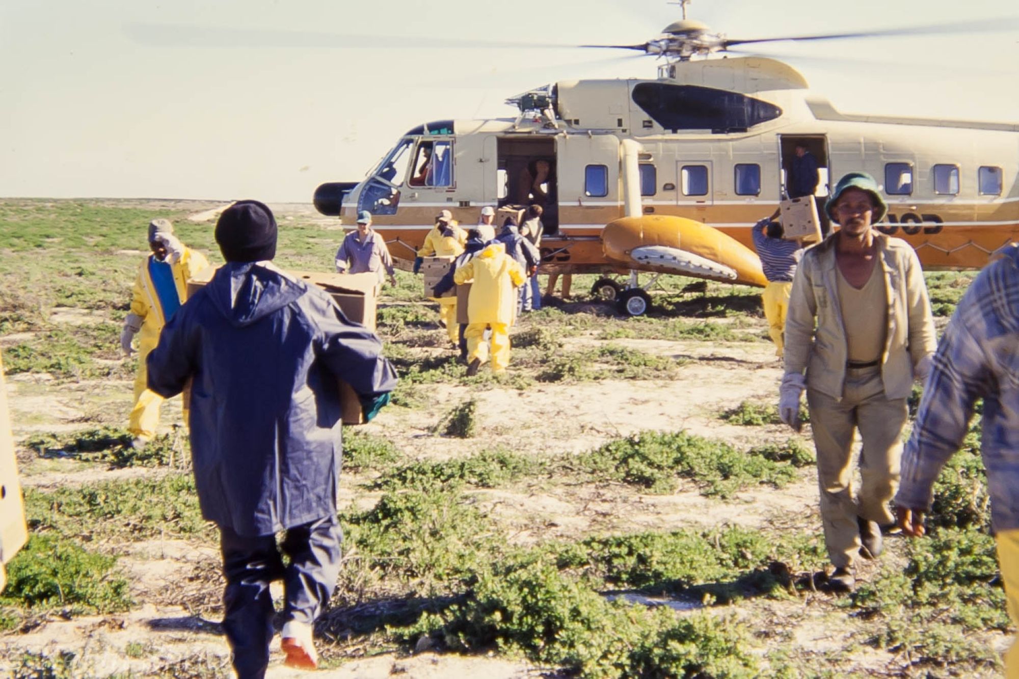 A huge warehouse in Cape Town was fitted out with the necessary equipment and portable pools as the rehabilitation centre did not have the capacity to cater for all the penguins. Volunteers from all over the world flocked to assist with the operation. In a first for the world it was decided to also remove un-oiled penguins from the two islands. The resources to clean oiled birds were strained and on the islands preventing of un-oiled birds going to forage at sea using barriers could not go on indefinitely. Just under 20 000 un-oiled Penguins were caught and removed from the two islands, placed in boxes (3 in a box) and transported to Port Elizabeth in cattle trucks, where they were released at Cape Recife.