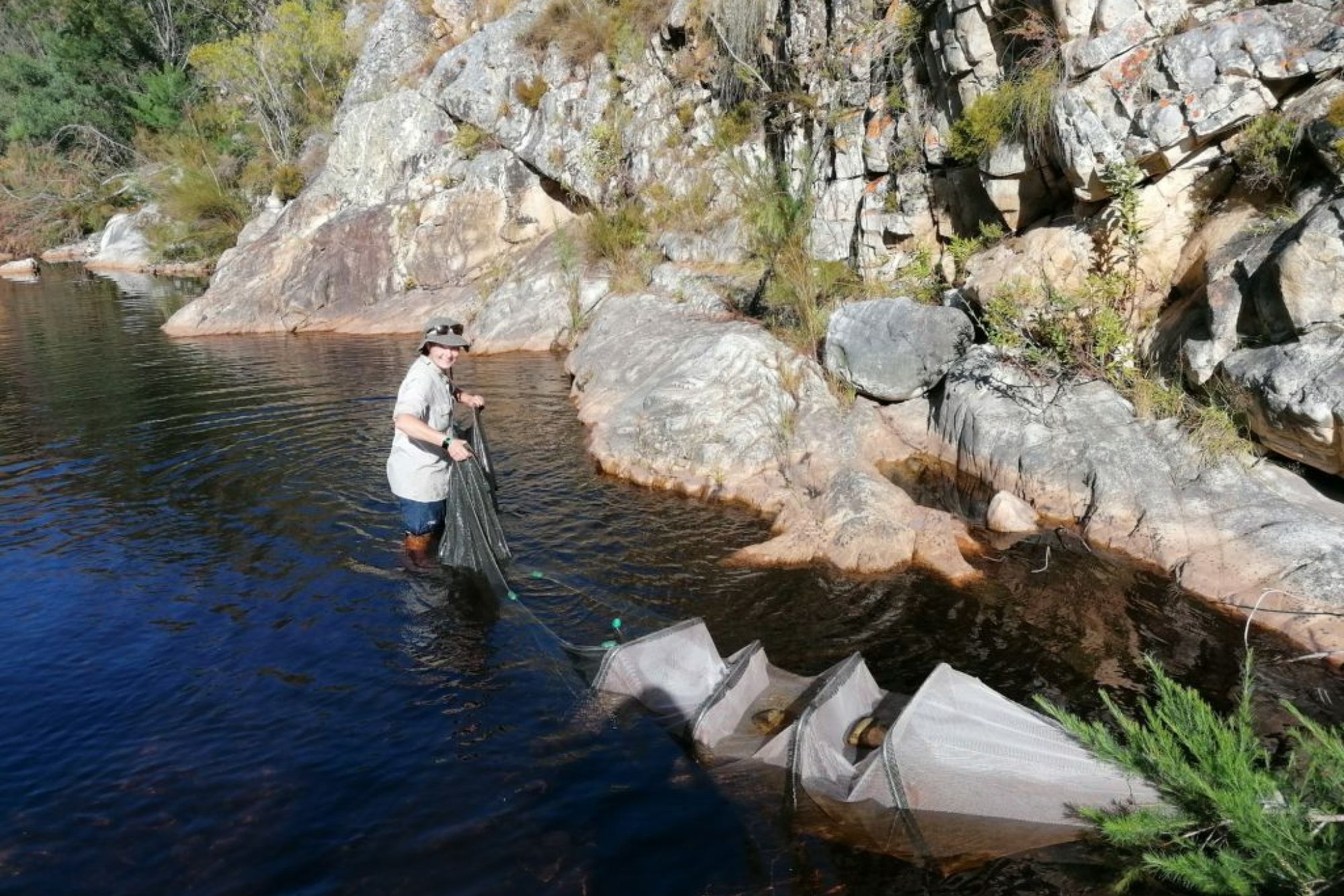 Sharptooth catfish are sadly fully established in mainstream habitat of many Western Cape rivers, most notably the Berg and Breede systems, and there is scientific evidence that they can also invade tributaries and headwater streams. These streams are home to indigenous and endangered freshwater fish species such as redfins Pseudobarbus spp., Cape galaxias Galaxias zebratus and Cape kurper Sandelia capensis. The ecological impacts of sharptooth catfish invasions in mountain tributaries are poorly understood and for this reason a monitoring project was initiated in the Gobos River in 2014 following the discovery of sharptooth catfish here in 2012. The Gobos River is a tributary of the Sonderend River with the confluence near the town of Greyton. Sharptooth catfish are abundant in the Sonderend River and as no instream barriers exists, this is the invasion source for the Gobos River.