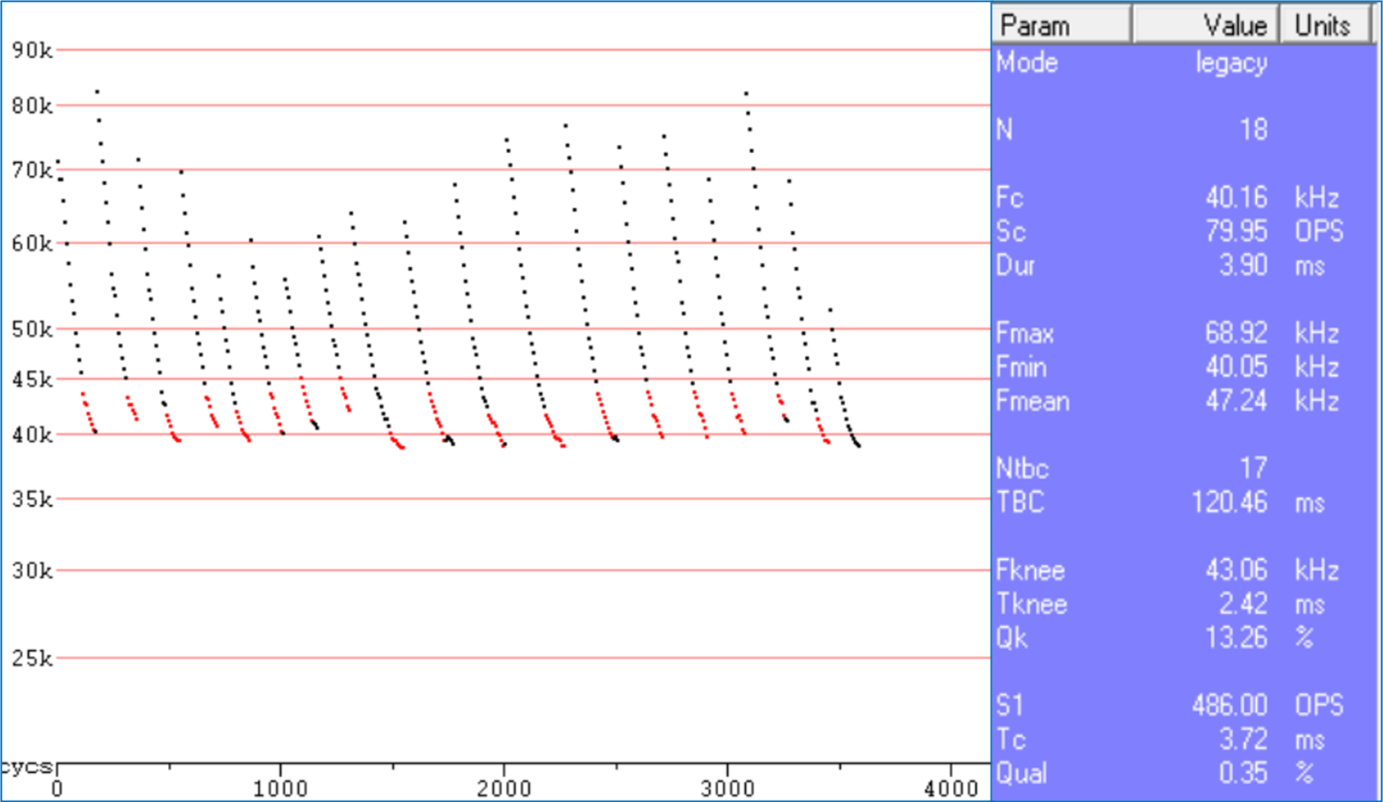 Typical N. capensis hockey-stick shaped call peaking at around 38 kHz. Sonogram characteristics used to identify bat species include peak frequency, bandwidth, call duration and the presence of harmonics (a sound wave that has a frequency that is a multiple of the fundamental tone).