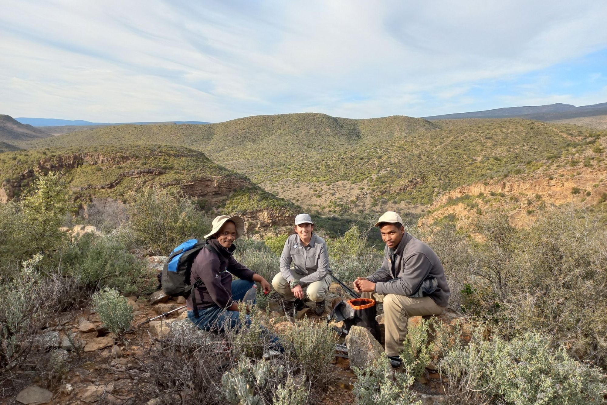 Three researchers working together in the Karoo: Cornelius Julies (CapeNature Senior Field Ranger, Gamkaberg), Anita Wilkinson (Senior Researcher, Cape Leopard Trust) and Charlton Abrahams (CapeNature Conservation Assistant, Gamkaberg).