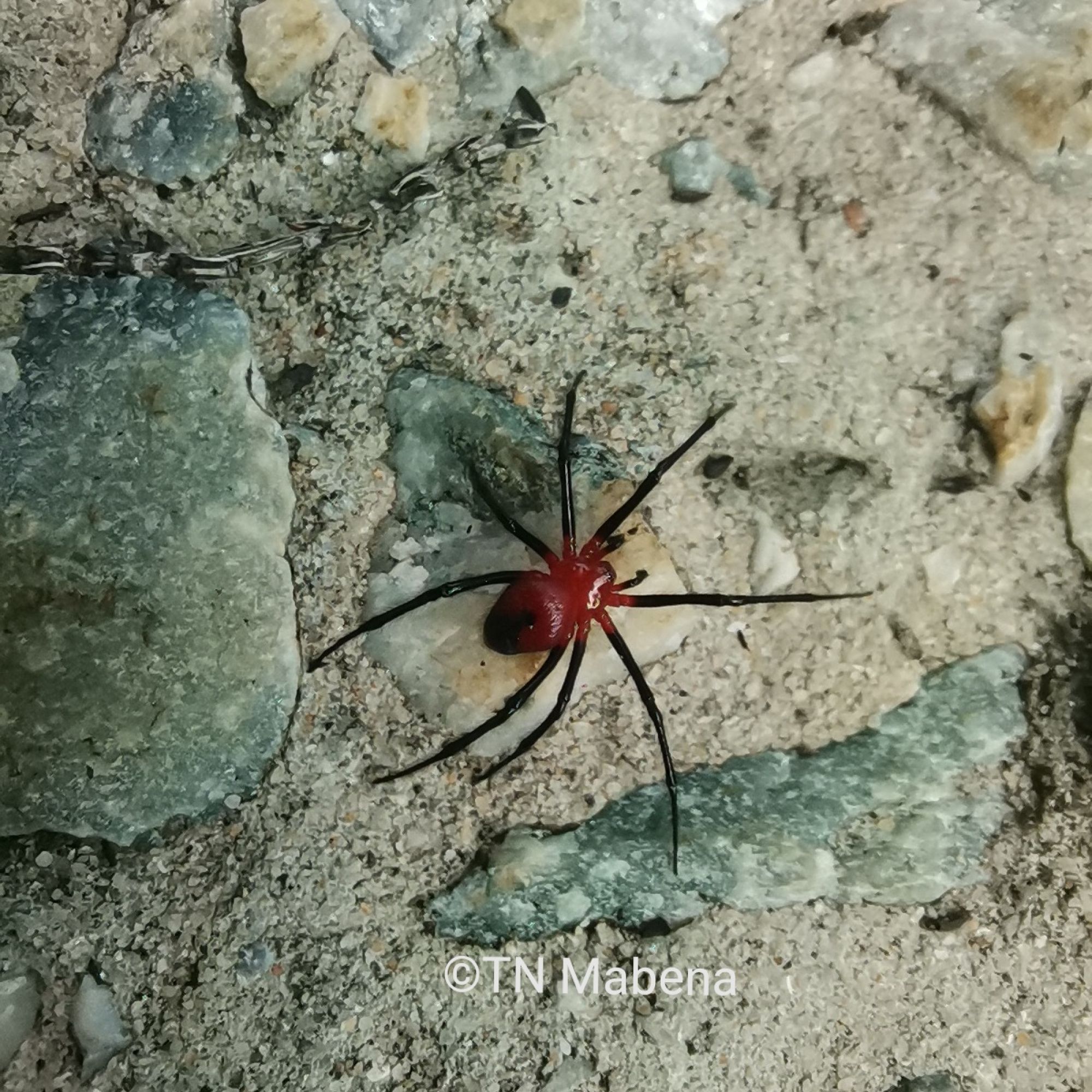 Using the photographs to look for distinctive features, the Field Rangers attempted to identify the species using guidebooks, but without success. One of the Field Rangers, Thandeka Mabena, utilised Google search, using the spider’s features as keywords (“bright red, black, spider, Western Cape”) and found an article, “New spider species discovered on Table Mountain National Park” published by ‘Cape Town ETC’ magazine dated 15 July 2020. The article link, together with the spider pictures were sent to the Landscape East Ecological Co-Ordinator, Natalie Baker, to further assist with identification.