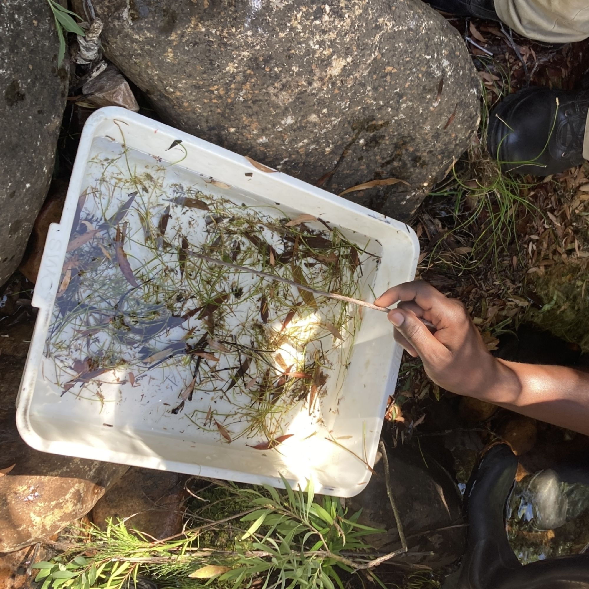 The vegetation sample in a white tray taken from the Olifants River at Wemmershoek Dam during November 2021. Photo taken by Lonwabo Mkosi.