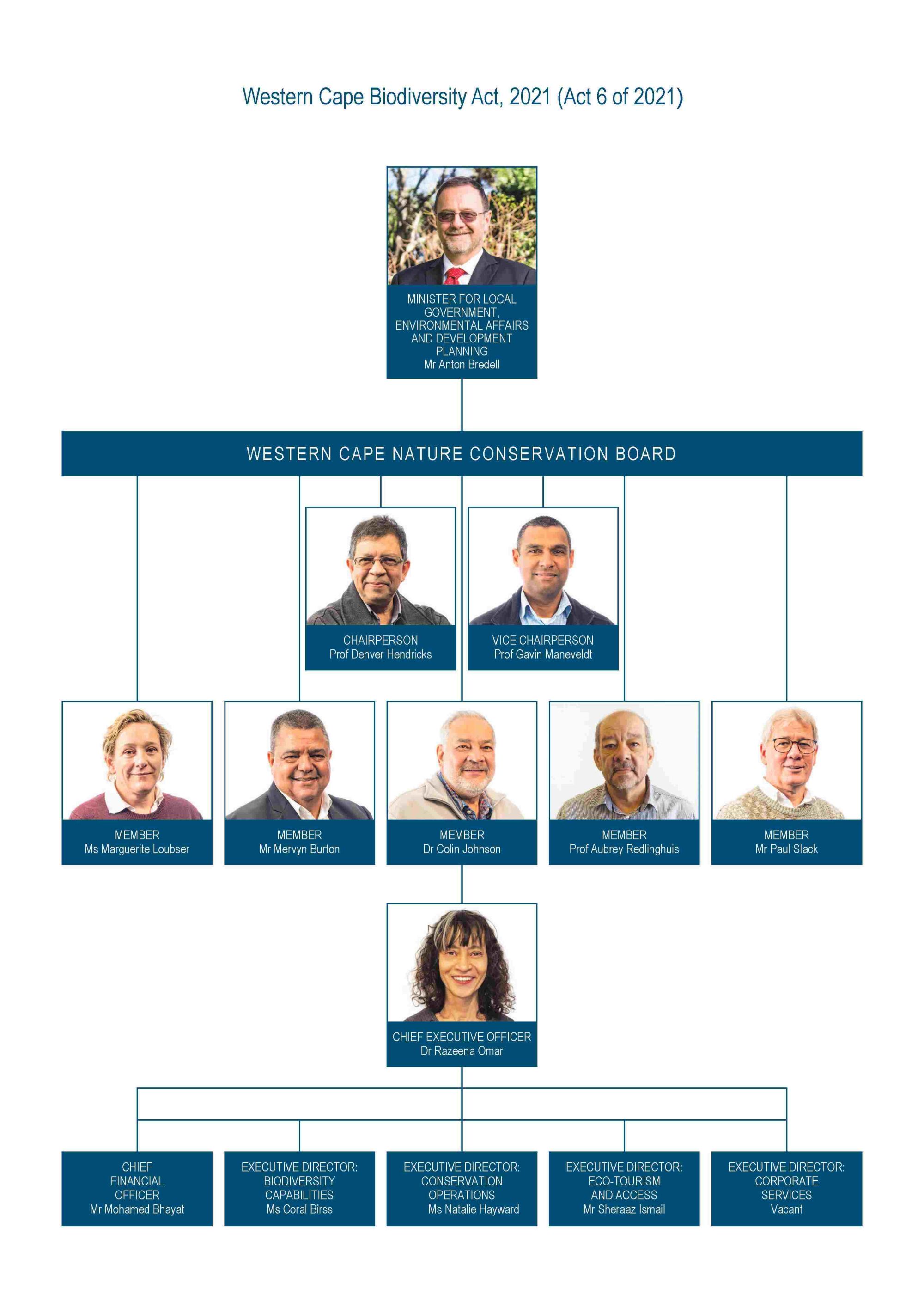 As a Schedule 3C Public Entity, CapeNature is governed by a Board as established in terms of section 9 of the Western Cape Biodiversity Act, No. 6 of 2021. The Board is appointed by the Provincial Minister for Local Government, Environmental Affairs and Development Planning. The Board comprises seven non-executive members and is supported by Board Committees to ensure that the mandated oversight role and responsibility is exercised.